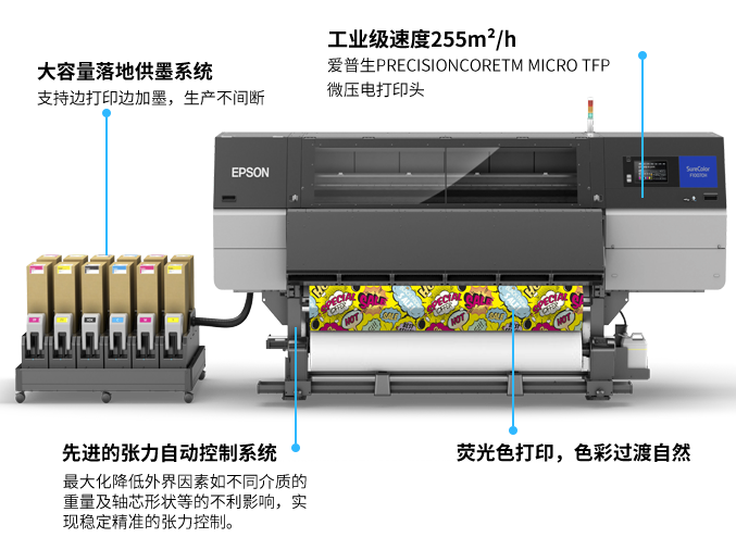 EPSON F9380雙噴頭高速打印機(jī),以1PASS速度:101平方/小時(shí),2PASS速度:60平方/小時(shí),3PASS速度:46平方/小時(shí)生產(chǎn)速度取得廣大客戶(hù)的信任。